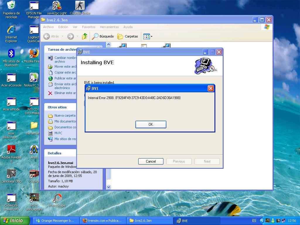 bueno pues esta tarde/noche o cuando tenga tiempo consigo una captura del error y la coloco asi veis, es el bve2 y como comente antes... si me dejo instalarlo en su dia.. me tiene que dejar hacerlo, puesto que es el mismo equipo, uso windows xp por si os sirve de algo.