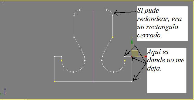 Y también siguiendo los consejos de Divi, he decidido comenzar desde cero mediante las splines y attachandolas como me dices. Todo me ha resultado más fácil que con anterioridad. He utilizado la opción Refine para añadir vértices donde lo necesitaba, y a continuación he ido eligiendo los segmentos que debía eliminar y Supr para al eliminar el sobrante y completar el contorno del gancho. Lo principal lo he logrado, ahora estoy intentando redondear algunos vertices con la opción Fillet. He logrado redondear los de arriba pero en determinadas zonas no me deja. ¿Tengo que soldar todo primero antes de aplicar Fillet? (El valor que doy a Fillet es suficiente para que no sobrepase el radio y me lo permita).