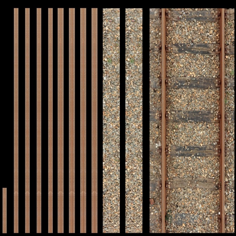 Bueno, pues ahora, nuestro querido RW y mi incompetencia probablemente, provoca parpadeos en als vias, y esos saltos negros entre las que supongo serán las secciones de 4m. que se crean en 3ds max. No sé si volverme loco o algo :lol: Por si es cosa del mapeo, o de las texturas, subo la hoja que estoy usando. Para hacer el mapeo y texturizar hice un Unwrap UVW, rendericé el mapeo en modo "normal" y fui superponiendo mis texturas al espectro de colores generado en los mapeos de los polígonos (no se si me he explicado bien, es decir, lo mismo que explicaba Pere en su tutorial)