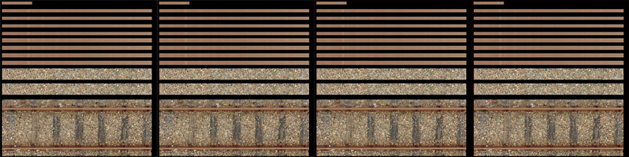 Esa franja negra que se repite en la textura no lo podemos considerar un fallo del RW, pues está reproduciendo tu textura que, como la vía resultante es más larga que la propia textura, ésta última se repite a lo largo de la vía "empalmando" repeticiones de la textura. Algo así: