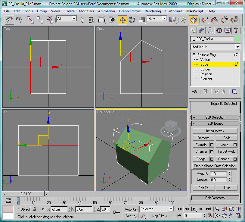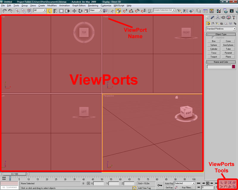 A destacar también que si hacemos clic con el botón izquierdo del ratón sobre el nombre del viewport, este pasa a ser el viewport activo sin perderse la selección del objeto actual. Esto es importante para poder editar un objeto de forma continuada en todos los viewports, como veremos más adelante.