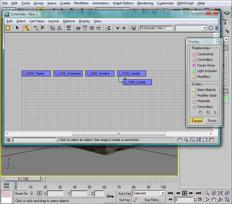 Ahora podemos previsualizar la casilla. En la ventana inferior izquierda aparecerán los objetos asociados a la casilla, entre ellos uno denominado "Humo" ;) lo seleccionaremos y nos aparecerá el "gizzmo" del objeto (las flechas esas con la bola). Arrastrando dichas flechas debemos colocar el emisor justo sobre la boca de la chimenea: