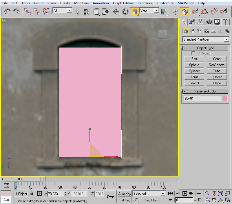 Una vez en posición, y mediante "Select and Scale" procederemos a dar un tamaño al cubo semejante a la ventana. El procedimiento será semejante al anterior, jugando con las dos flechas.