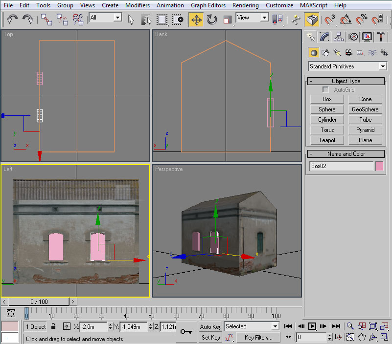 Desplazaremos el cubo hasta la posición de la ventana. Esto lo podemos hacer mediante "Select and Move" y, en la vista lateral, pinchando con el ratón sobre las dos flechas, verde y roja, que aparecen sobre el "pivot" del cubo.