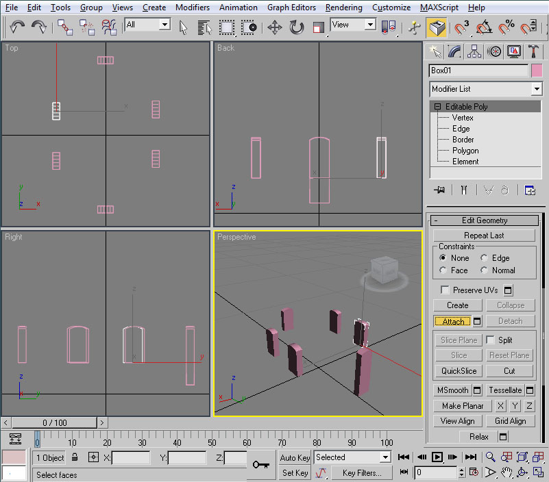 Iremos a la vista en perspectiva, donde centraremos la ventana y el cubo. Como éste último está situado "sobre la pared", con la casilla seleccionada pulsaremos las teclas "Alt" + "X", con el fin de volver temporalmente semi-transparente la casilla y así ver en su totalidad el cubo sobre el que vamos a trabajar. En esta situación, convertiremos el cubo en "Editable Poly", pasaremos a modo aristas ("Edge") y seleccionaremos, de las aristas superiores, las anterior y posterior respecto al lado largo del cubo (las señaladas en rojo en la imagen):