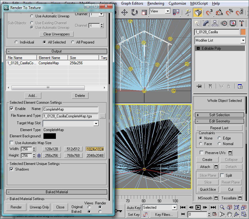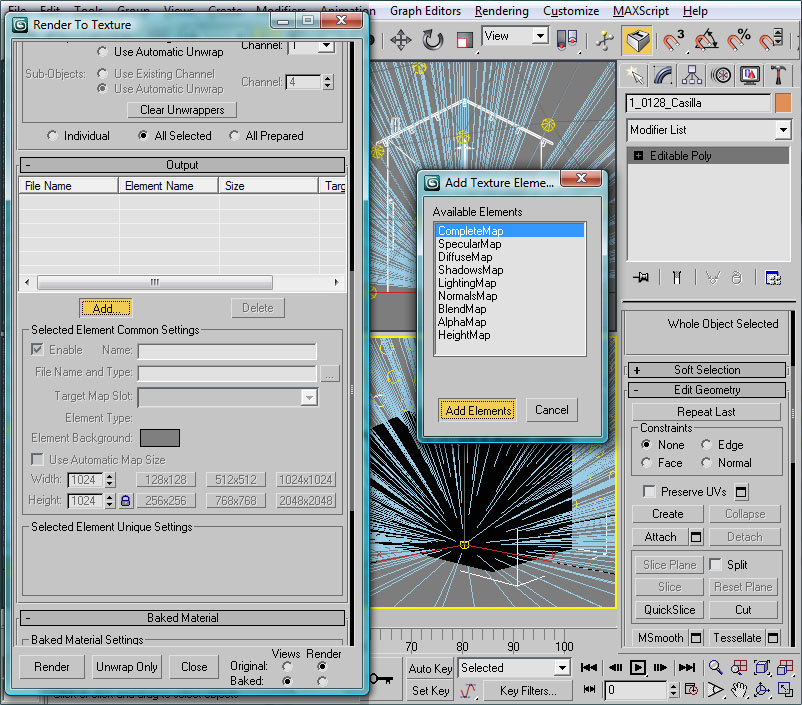 Si en el Stack de modificadores observamos que tenemos varios modificadores (tendremos un "Unwrap UVW" sobre "Editable Poly") desplegaremos el menú contextual del Stack de modificadores para solicitar un "Collapse All". De esta forma consolidamos dichos modificadores en la pieza y podemos seguir a partir de este punto. Esta operación de consolidar todos los modificadores de una pieza la deberíamos realizar cada vez que queramos dar por buenas las operaciones efectuadas, para evitar que éstas nos afecten a nuevas modificaciones, o siempre antes de exportar el modelo.