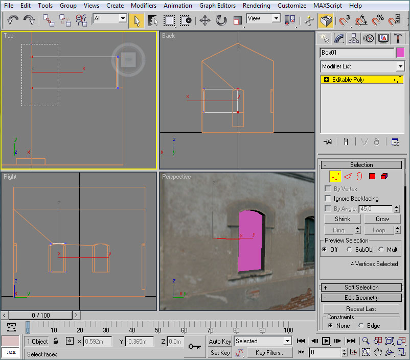 Para proceder a borrarlos. Con esto habremos eliminado todas las caras del cubo menos la que se orienta hacia el exterior de la ventana.