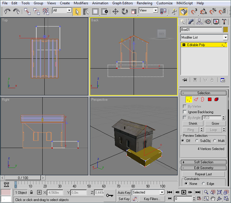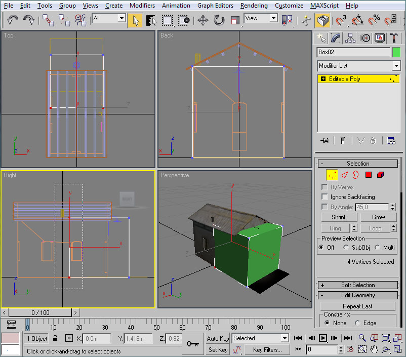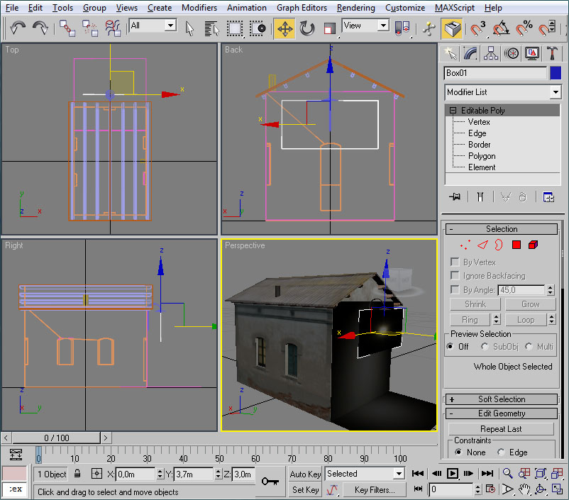 Ahora iremos al 3ds para crear un polígono sobre la ventana que deseemos que esté iluminada por la noche. Dejaremos visible tan sólo el cuerpo de la casilla "cercano" 1_0256_Casilla, y sobre el Viewport Right crearemos un cubo de las dimensiones aproximadas de la ventana a cubrir, y le daremos suficiente longitud para que, partiendo del eje central de la casilla, llegue a cubrir la cara de la ventana: