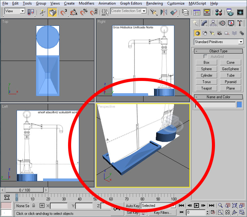Donde he señalado en rojo el procedural, el cual recuerdo que debe tener todos sus puntos con la coordenada Y=0 (coordenada en 3ds), el pivote centrado en la escena y la extrusión de dicho procedural orientada en la dirección Y del pivot del objeto (con la longitud que deseemos para las texturas).