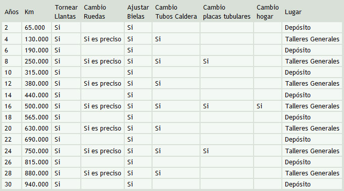 • La siguiente visita a los talleres generales, en el cuarto "levantamiento" a los 250.000 kilómetros (y segunda "gran reparación"), además de las operaciones anteriores se añadía el cambio de las placas tubulares. Una vez cada ocho años