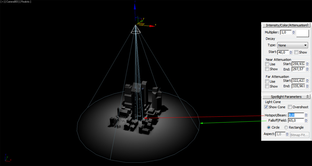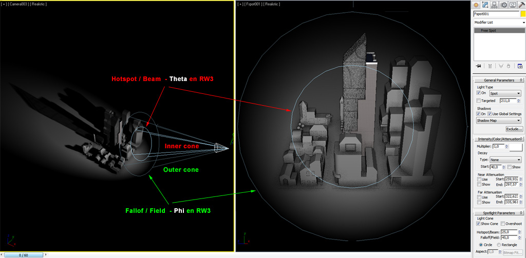 Dentro del cono interior (Inner cone), con el ángulo definido en "Hotspot/Beam" o "Theta" en Directx y RW3, la luz impacta con la máxima intensidad en la zona del círculo interior. La intensidad de la luz va decreciendo hasta llegar a 0 en el espacio delimitado por el cono exterior (Outer cone) según su ángulo definido por "Fallof/Field" o "Phi" en Directx y RW3, delimitando por el cículo exterior la zona a partir de la cual no hay luz.