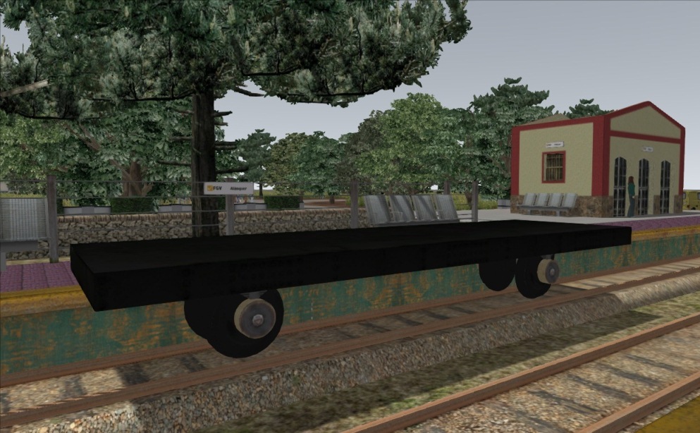 Bueno, esto que os muestro es el resultado de los tutoriales de 3dsMax de Pere y algo que dice sobre vagones alguno de los DevDocs. Sé que no es gran cosa, pero es mi primera realización de material rodante, y la verdad, y aunque todavía le faltan los últimos toques, edstoy bastante contento. Sé que hay muchas cosas mejorables, pero me gusta cómo está ahora. Conseguí exportar exitosamente el bastidor al simulador y, sin enganches todavía, se ve así: