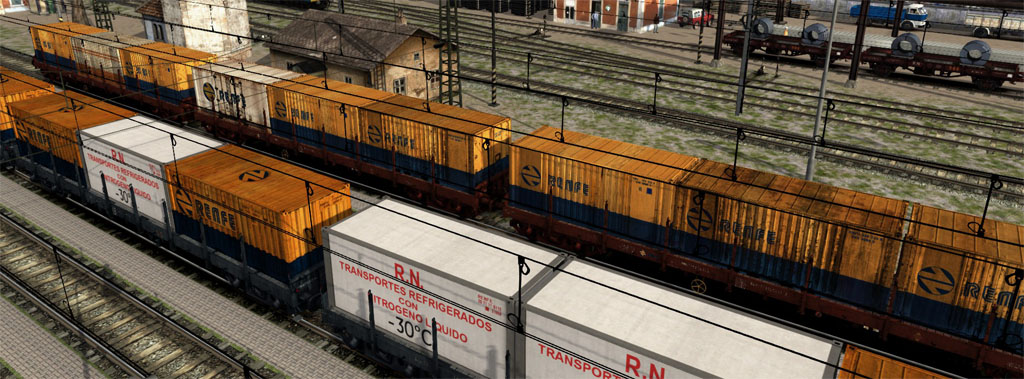 He diseñado contenedores 3D de diversas épocas, unos con texturas fotográficas del propio Adrián, otros hechos por mi a partir de fotografías de Javier López y también imitando texturas de la realidad, convenientemente retocadas para que parezcan reales, correspondientes sobretodo a contenedores de los años 70, 80 de los que es muy difícil encontrar fotos aprovechables. La idea es que las plataformas carguen contenedores de acuerdo a la época en que circularon.