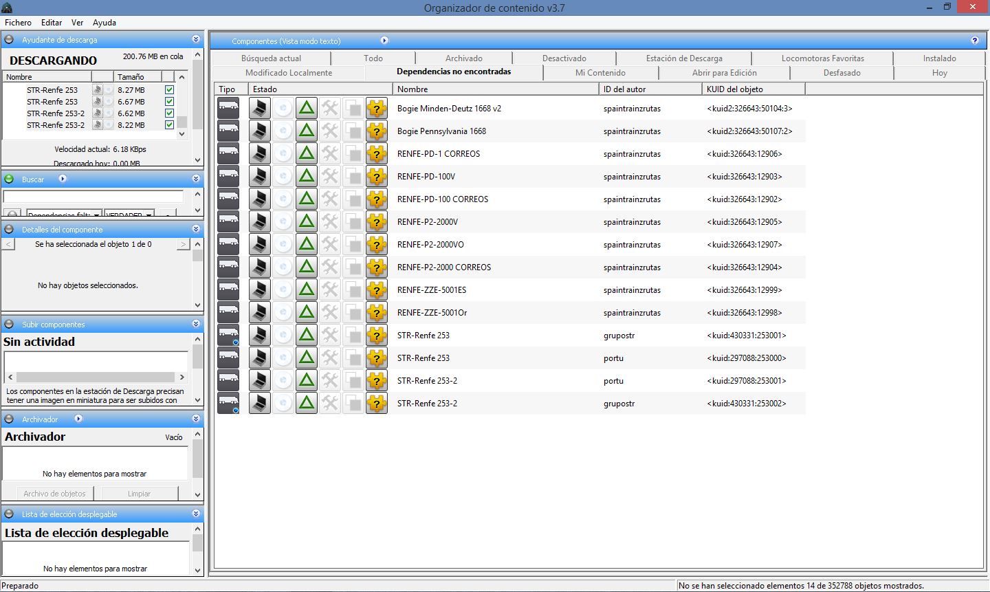 Tengo exactamente el mismo problema, estoy en el content manager. Busco la locomotora que me he descargado (en este caso la 253), me voy a dependencias no encontradas y doy click derecho y descargar. Veo que se descargan y aparece el tick verde. Luego me voy a las cocheras del juego y sigue sin aparecer en la vía...