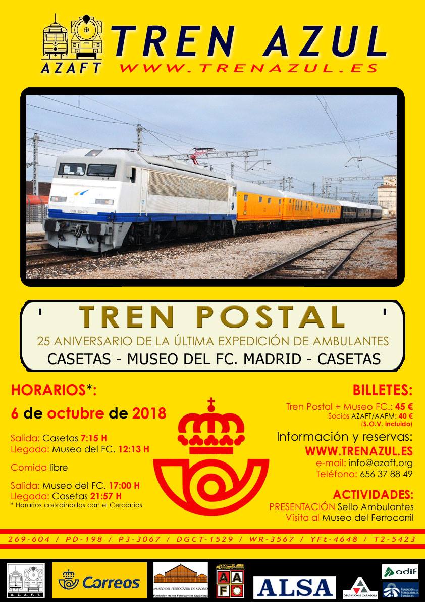 Con motivo de la presentación del sello conmemorativo del 25 aniversario de la última expedición de los ambulantes postales, CORREOS junto con AZAFT han organizado una circulación muy especial: el TREN POSTAL que circulará el próximo 6 de octubre desde la zaragozana estación de Casetas hasta el Museo del Ferrocarril de Madrid (en la antigua Estación de Delicias). La composición será la habitual del Tren Azul, incluyendo los tres coches de CORREOS (dos estafetas postales y un furgón postal). El tren estará operado por ALSA, y la locomotora titular será la 269-604 "Gato Montés" que mantiene en perfecto estado de marcha la Asociación de Amigos del Ferrocarril de Madrid.