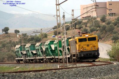 En la misma zona, la 269-066 lleva 6 tolvas de clinker vacías hacia Los Prados. Pizarra, 08-10-2007.