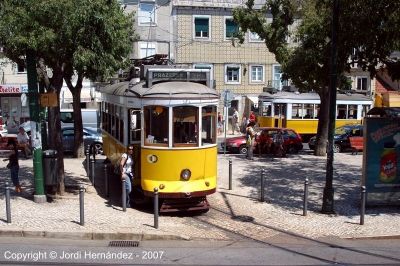 CARRIS 02: Tranvías del tipo Estándar Remodelados (nueva construcción en 1995), con truck AEG i equipo eléctrico Kiepe, en el Largo de Graça.